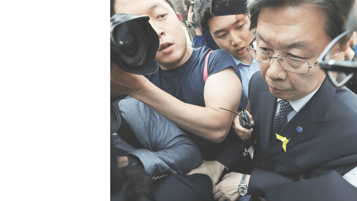 Sur cette image du 21 mai, le président de KBS, Gil Hwan-young, est dans la tourmente : les employés de la chaîne demandent sa démission. Les grévistes accusent le chef de la chaîne d’entretenir des liens trop étroits avec le gouvernement et de diffuser des informations erronées. La Maison Bleue l’a nommé chef afin de mieux surveiller KBS.
